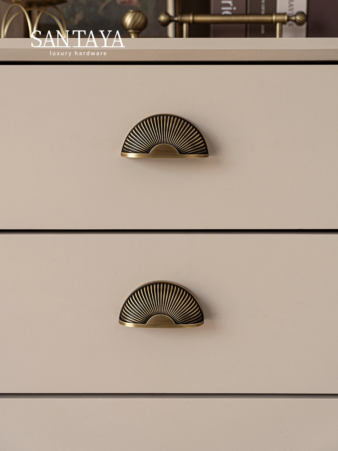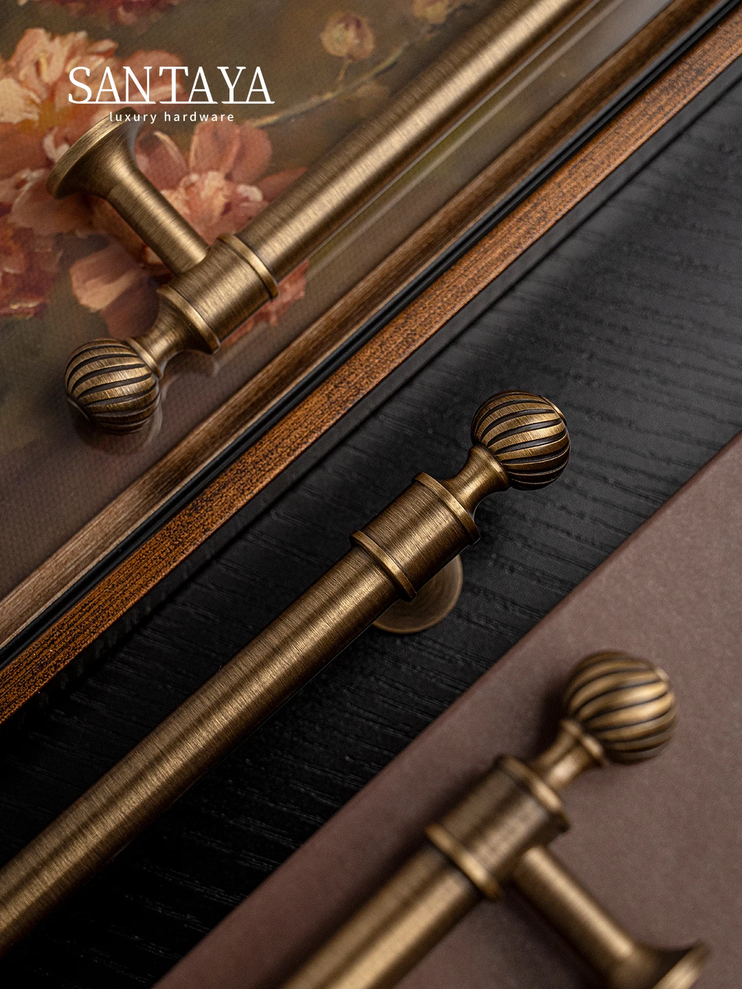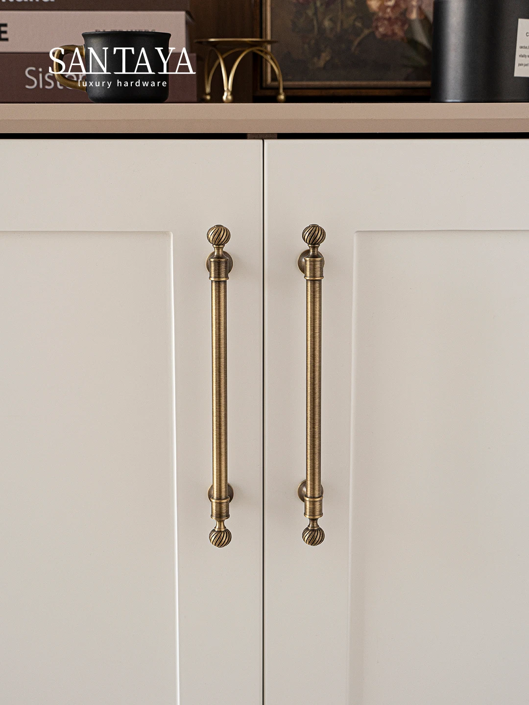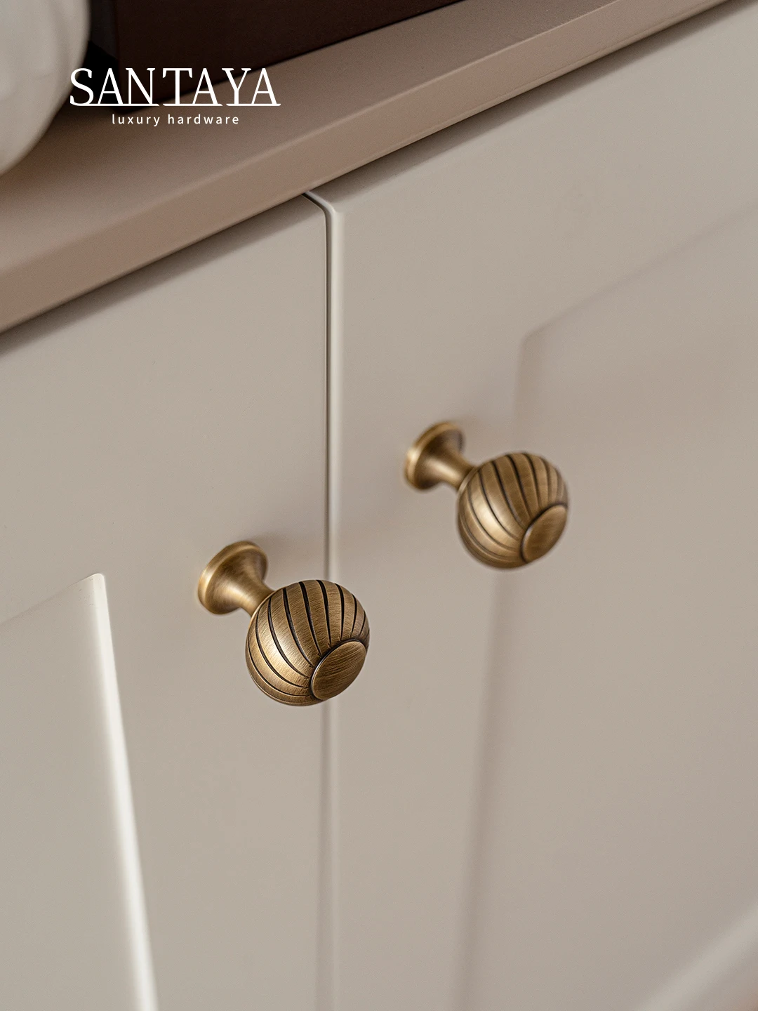 These brushed antique brass cabinet handles add a luxurious touch to furniture.